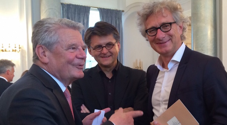 Der Bundespräsident ehrt vier berühmte Architekten - beim festlichen Empfang sind Martin Gruber und Prof. Kleine-Kraneburg, die Erbauer des Präsidentialamtes, dabei.