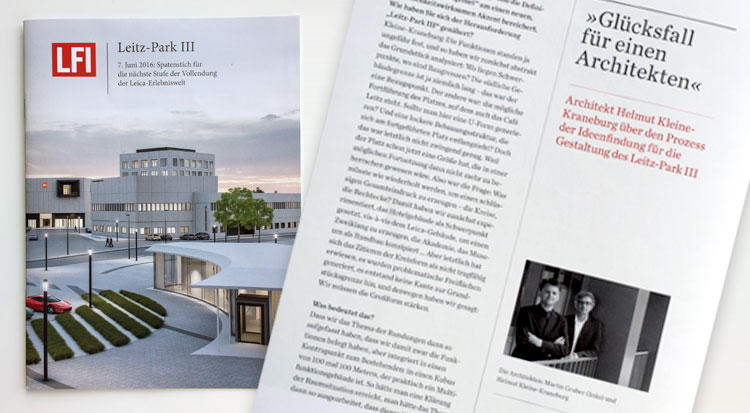Prof. Helmut Kleine-Kraneburg gibt LFI - Leica Fotografie International ein Interview über den über den Prozess der Ideenfindung für die Gestaltung des Leitz-Park III - "ein Glücksfall für einen Architekten". (LFI - Leica Fotografie International, Sonderedition Spatenstich 7. Juni 2016, S. 12-16)