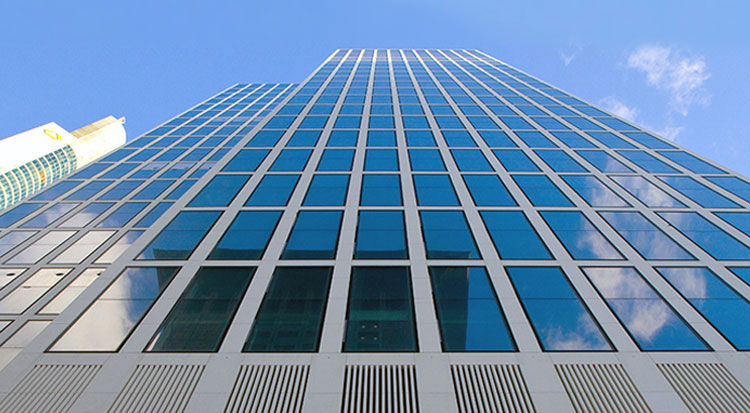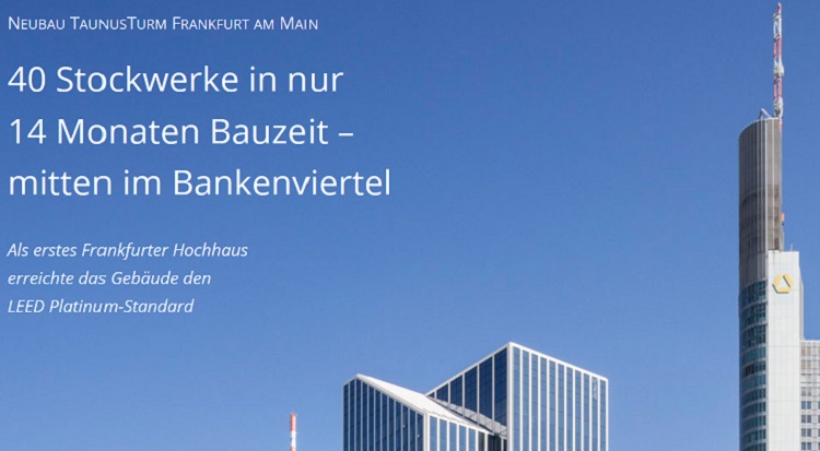 „40 Stockwerke in nur 14 Monaten Bauzeit – mitten im Bankenviertel – Als erstes Frankfurter Hochhaus erreichte das Gebäude den LEED Platinum-Standard“ Referenzbauten.de berichtet über den Taunusturm