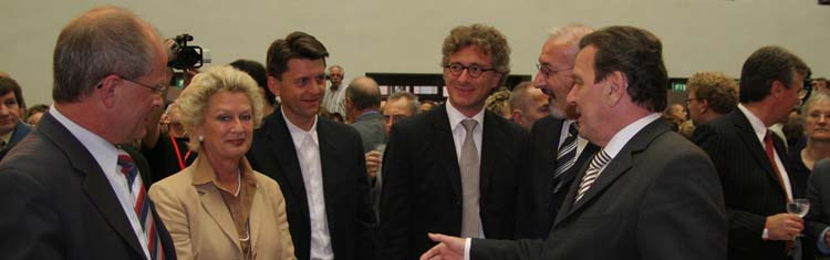 Gäste: Bundeskanzler Gerhard Schröder, der DGB-Vorsitzende Michael Sommer, der Präsident von Gesamtmetall, Martin Kannegiesser, und Frankfurts Oberbürgermeisterin Petra Roth. Bundeskanzler Gerhard Schröder über den Neubau: „Machtbewusst aber nicht kolossal – Ort an dem Vernunft gelebt werden kann“. IG-Metall-Chef Jürgen Peters: „Solide und selbstbewusst, weder protzig noch unbemerkbar. – Mit dem Gebäude kann die Gewerkschaft mit ihrer Geschichte und ihrer Zukunftsfähigkeit interpretiert werden.“ Petra Roth: „Das Gebäude bereichere die Skyline, fördere das Leben und Wohnen am Fluß.“